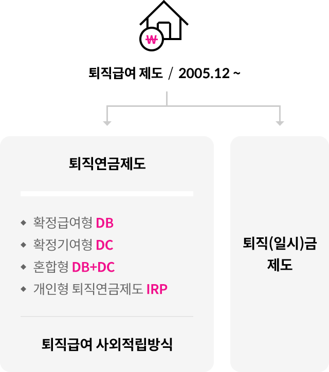 사용자(기업)은 "확정급여형(DB), 확정기여형(DC)" 또는 현행 퇴직금 제도 중 1개 이상의 제도를 설정 및