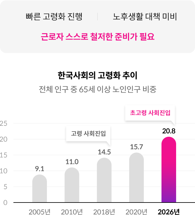 현재 우리나라는 빠른 속도로 기대수명이 증가하는 등 고령화가 진행되는 반면에 노후생활을 위한 대비책은 미비한 상황입니다.